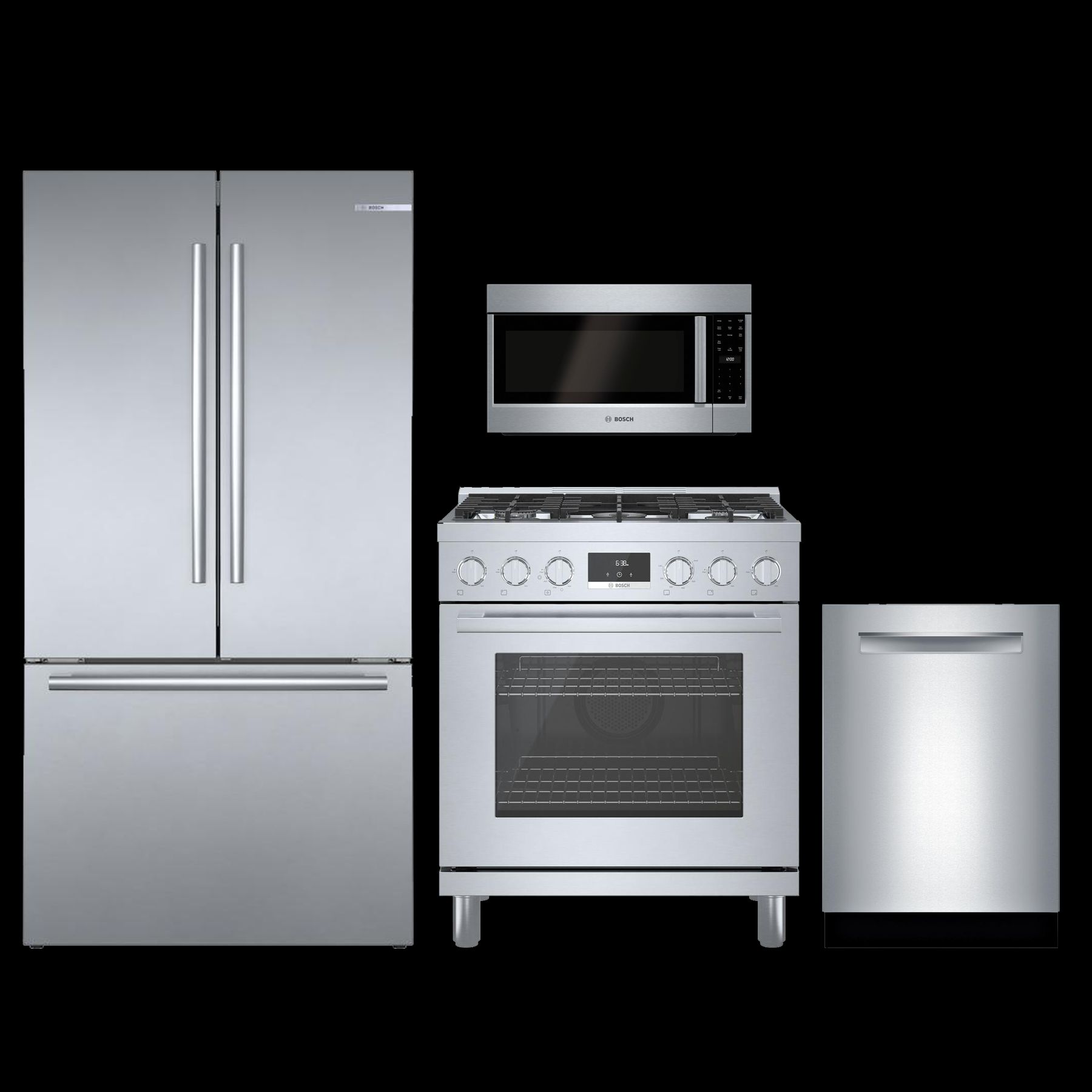 Bosch 4 Piece Kitchen Package-Stainless Steel with a counter depth french door refrigerator, free standing electric range, built-in dishwasher and over the range microwaveRead More