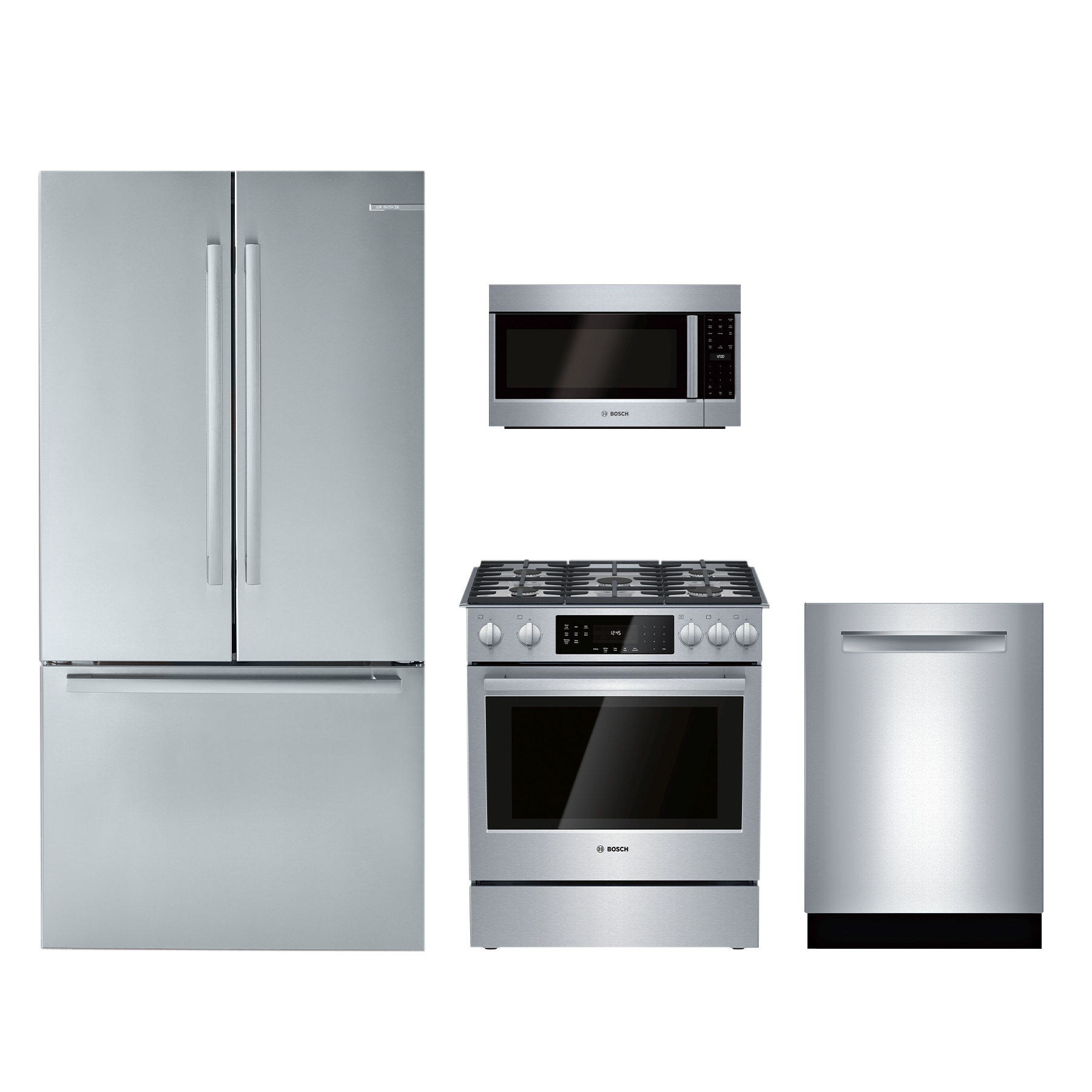 Bosch 4 Piece Kitchen Package-Stainless Steel with french door refrigerator, slide in gas range, over the range microwave and built in dishwasherRead More