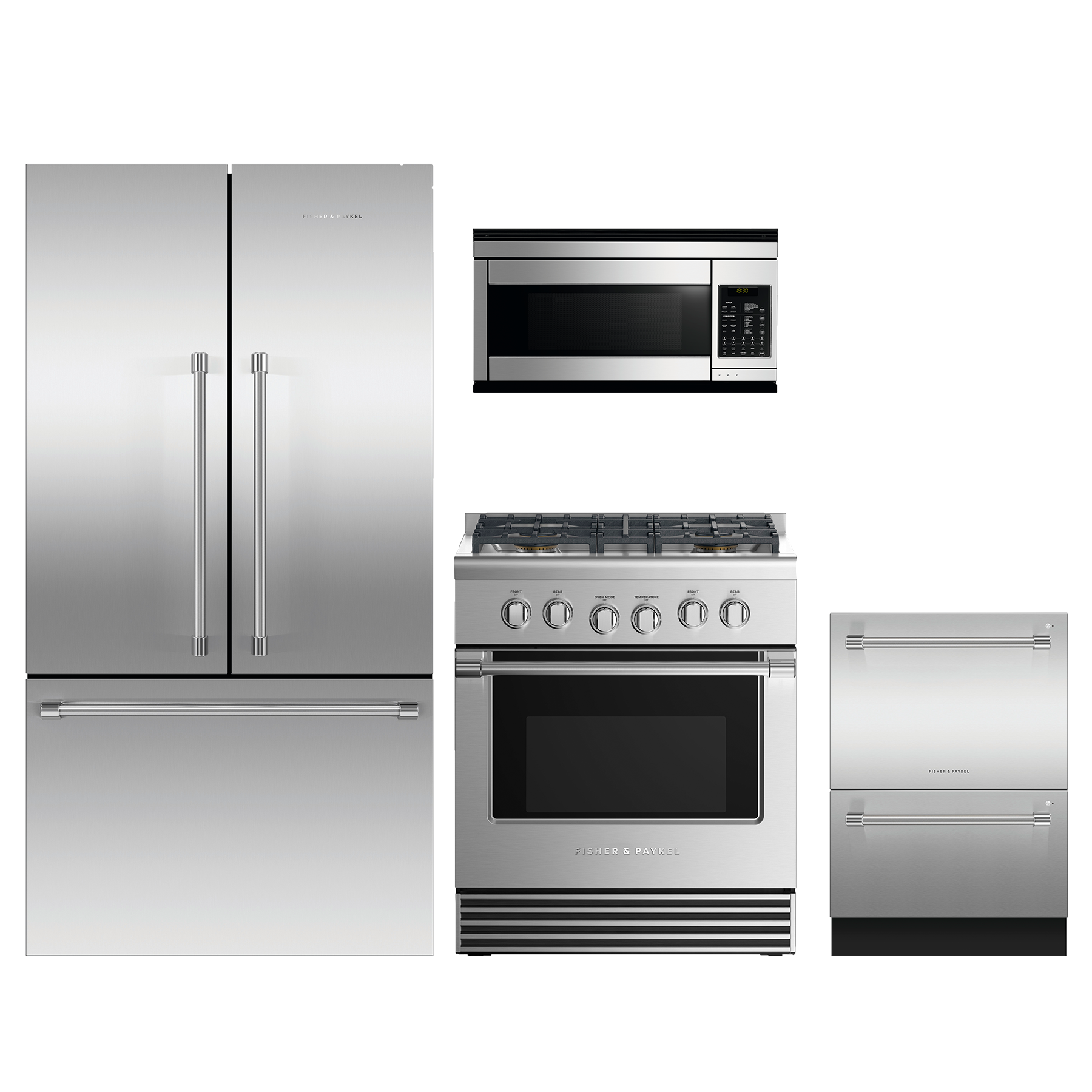 Fisher & Paykel 4 Piece Kitchen Package-Stainless Steel with a french door refrigerator, pro style gas range, double dishdrawer™ dishwasher and over the range microwaveRead More