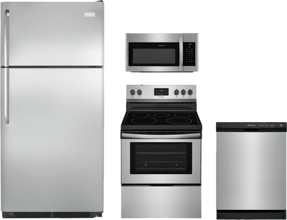 Frigidaire® 4 Piece Kitchen Package-Stainless Steel with a top freezer refrigerator, freestanding electric range, built in dishwasher and over the range microwaveRead More