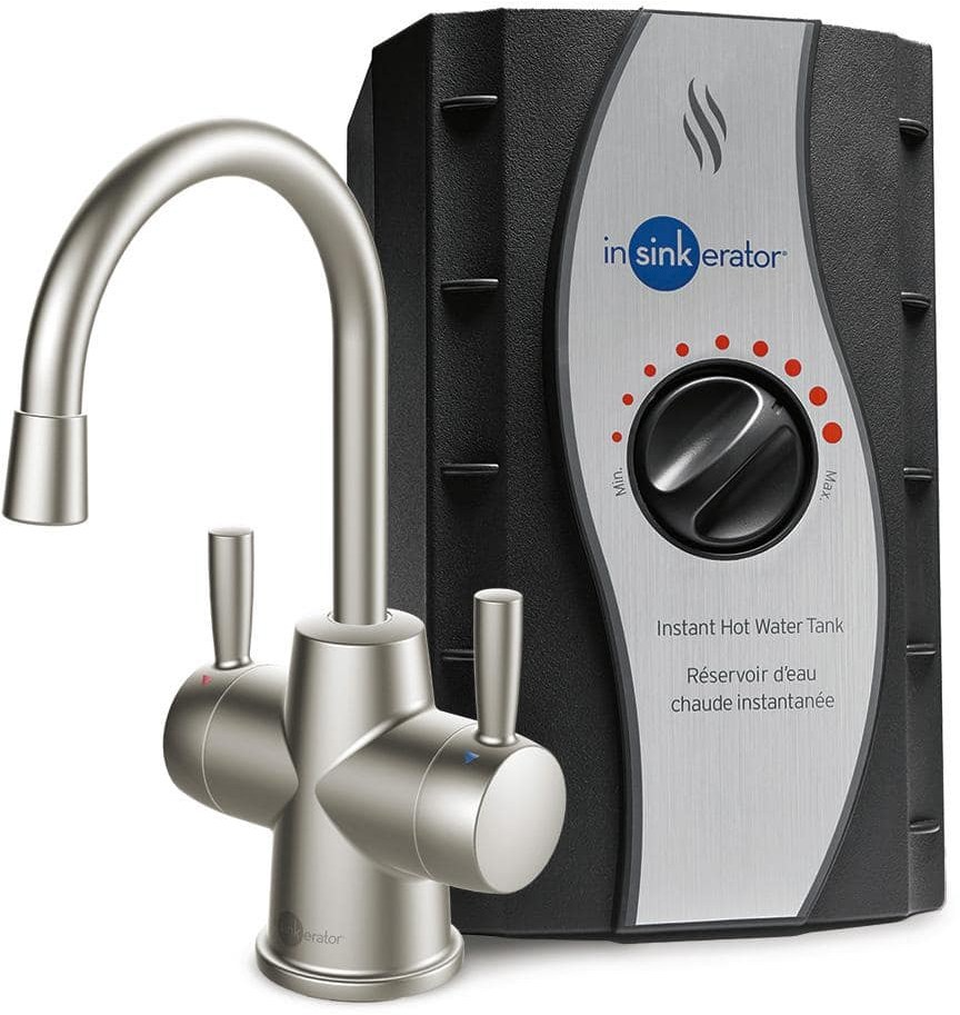 InSinkErator HOT250 Hot/Cold Instant Hot Water Dispenser with 8.21-inch faucet height, 3.96-inch width, 2-handle, chrome faucet and 750-watt, 2/3-gallon, stainless steel tank with adjustable temperature controls for near-boiling hot water and filter-ready cold water.Read More