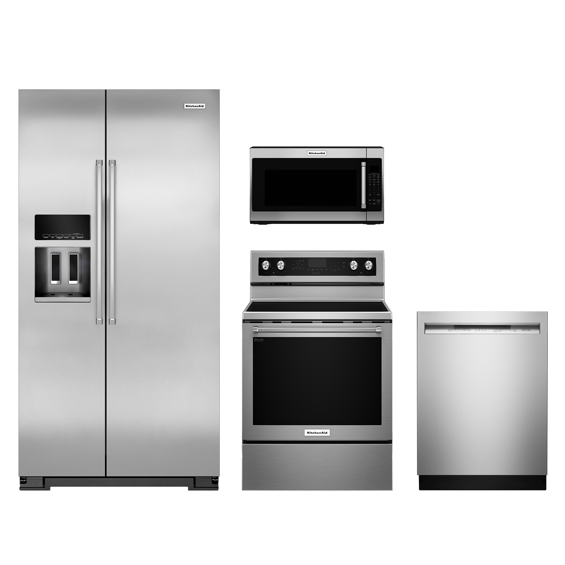 KitchenAid® 4 Piece Kitchen Package-Stainless Steel with a counter depth side by side refrigerator, free standing gas range, built in dishwasher and over the range microwaveRead More