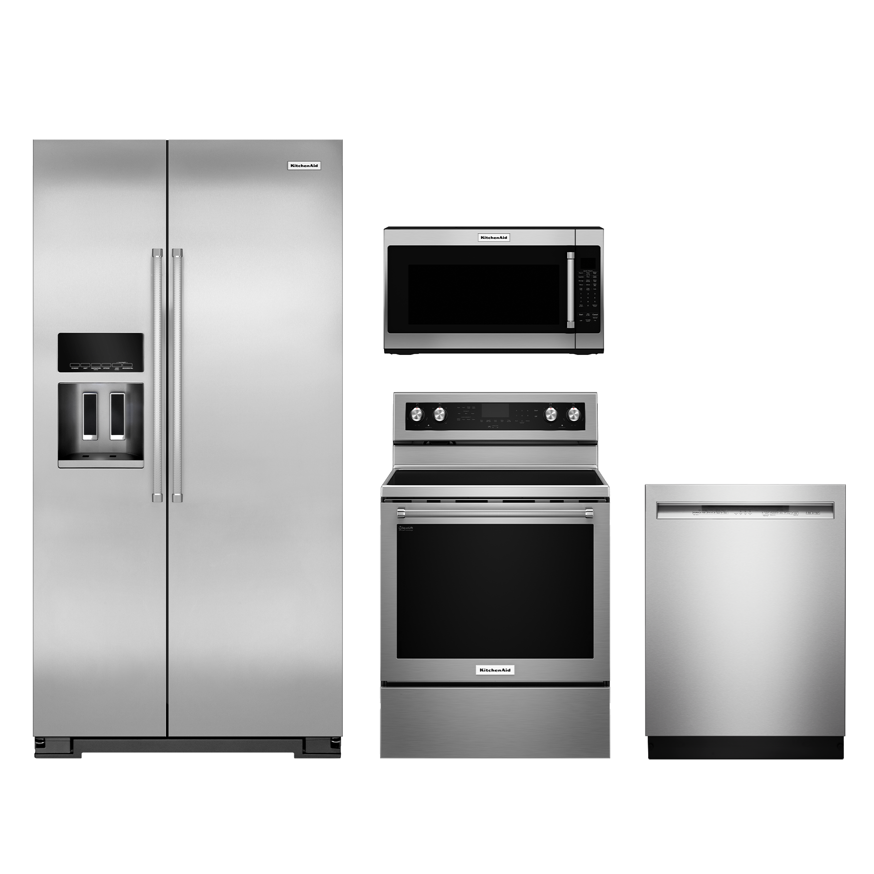 KitchenAid® 4 Piece Kitchen Package-Stainless Steel with a counter depth side by side refrigerator, free standing electric range, built in dishwasher and over the range microwaveRead More