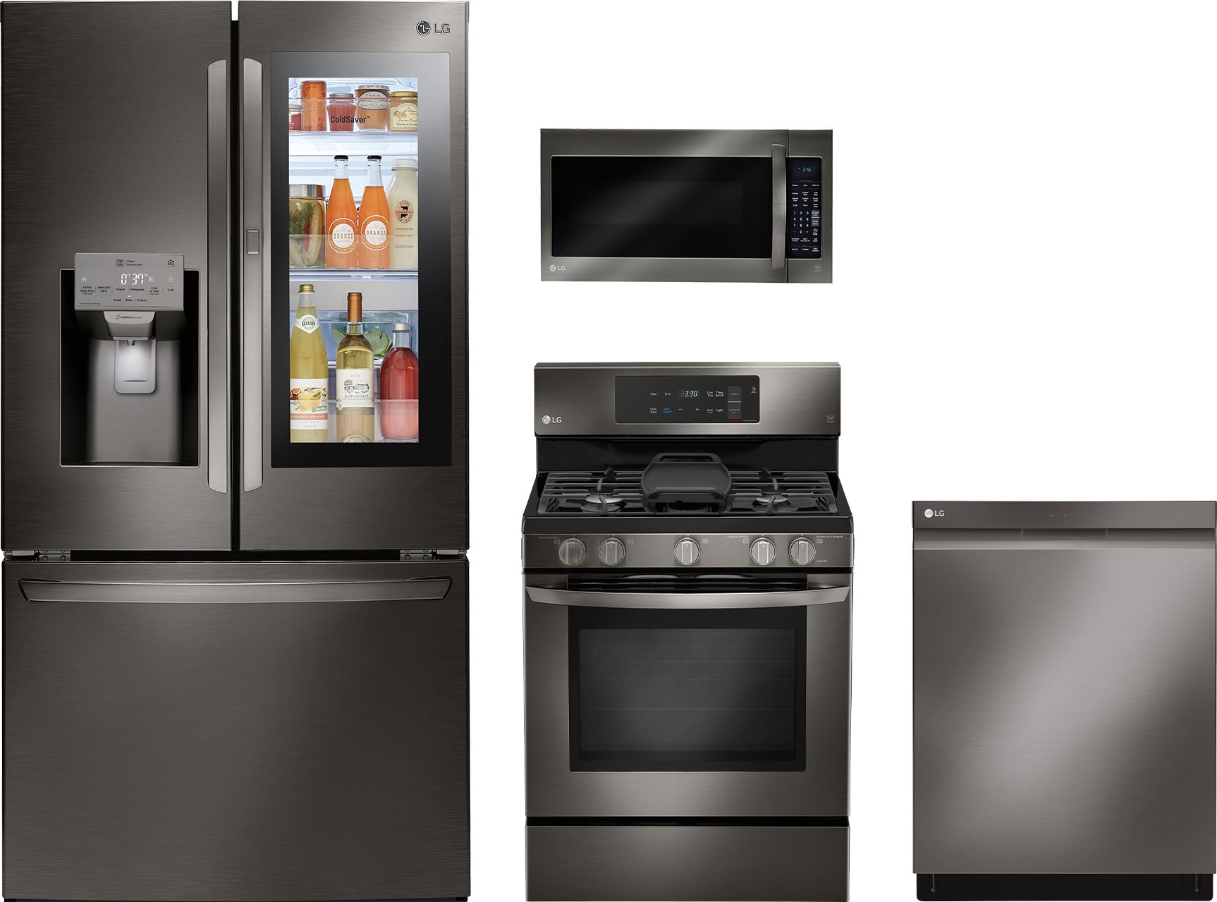 LG 4 Piece Black Stainless Steel Kitchen Package with a french door refrigerator, free standing gas range, front control dishwasher and over-the-range microwave ovenRead More