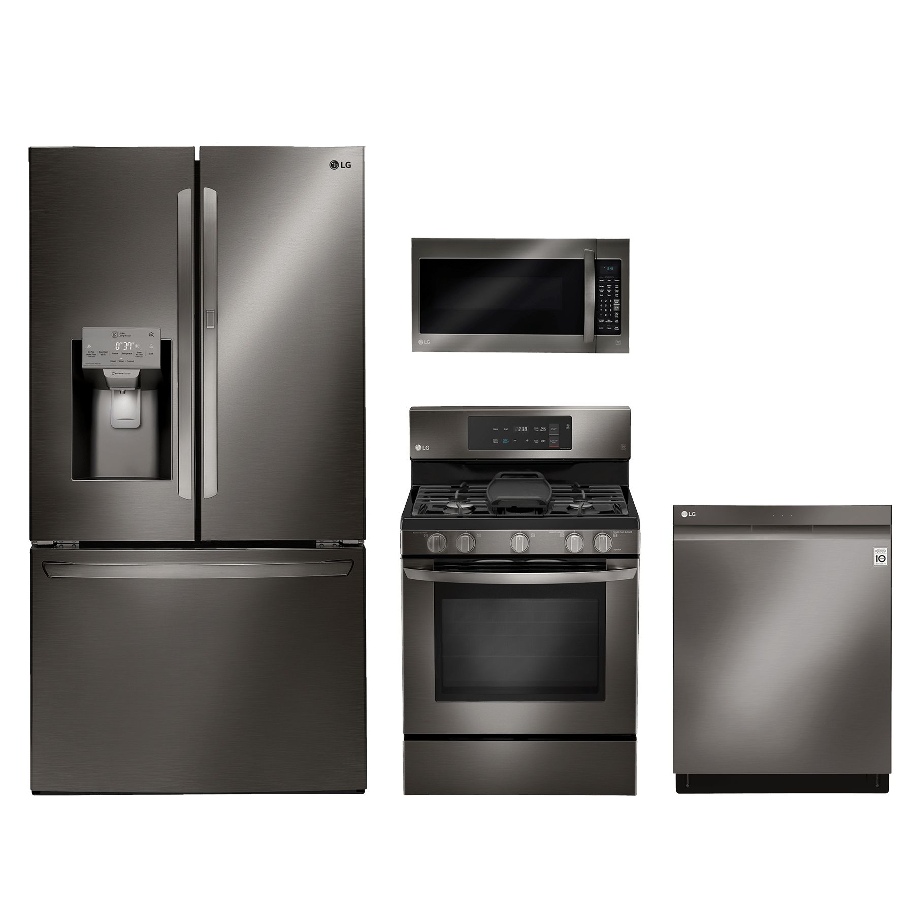 LG 4 Piece Kitchen Package-Black Stainless Steel with 3-door french door refrigerator, freestanding single oven gas range, top control built-in dishwasher and over the range microwave ovenRead More