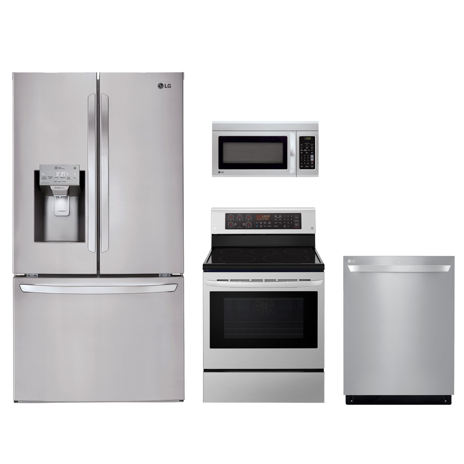 LG 4 Piece Kitchen Package-Stainless Steel with a french door refrigerator, free standing electric range, built in dishwasher and over the range microwaveRead More