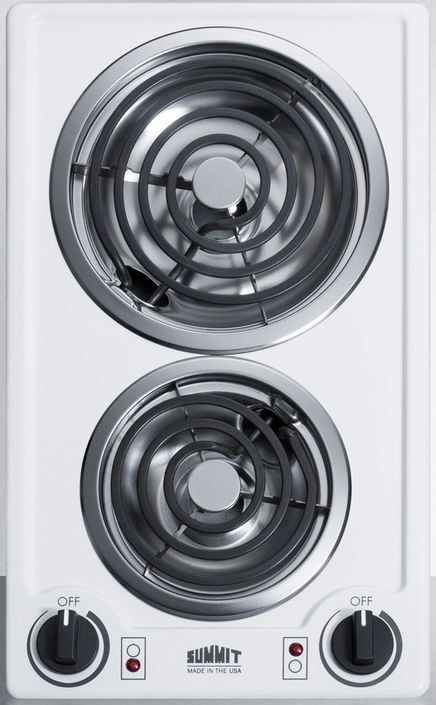 Summit offers an extensive selection of slim-fitting cooktops designed and manufactured in the USA. The CCE211WH is a 115V cooktop with a porcelain surface in a classic white finish. Two coil elements (6" 600W in front and 8" 900W in rear) offer durable heating, with removable chrome drip pans included. The push-to-turn knobs are simple and intuitive, with indicator lights that show which burner is in use for added safety. The recessed design helps to contain spills for a cleaner cooking experience. This cooktop includes a 3-pronged 4' long power cord for convenient installation. It is designed to fit common 11 1/8" W x 19 1/8" D counter cutouts. Additional choices are available in black and stainless steel, as well as radiant, induction, and gas cooktops in similar sizes. Browse our website for our complete selection of slim-fitting cooking appliances.