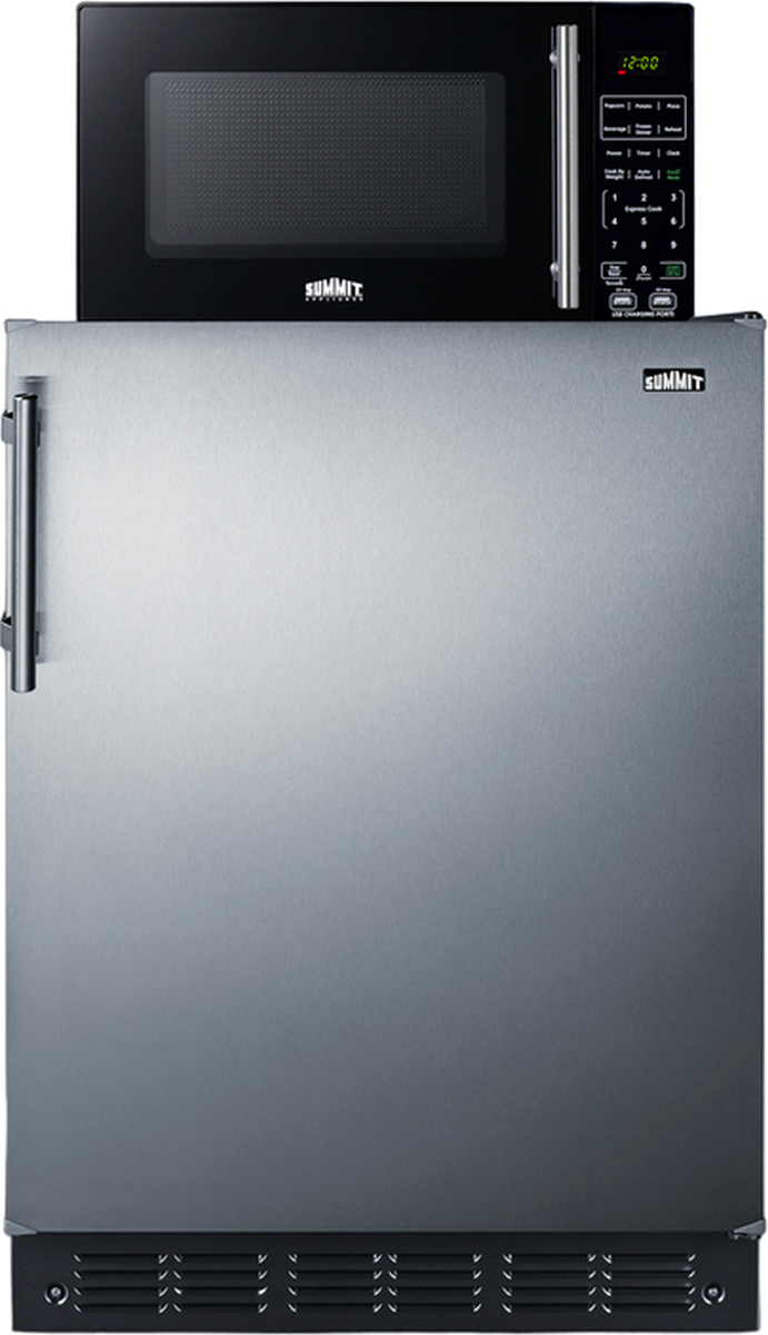 Model MRF708BLSSA combines a fully featured microwave with our European FF708BLSS freezerless refrigerator. The complete unit is sized at just 24" wide for an easy fit. The refrigerator's reversible door make it easy to adjust to any setting, while the microwave includes a built-in allocator, allowing you to plug the fridge directly into the microwave.Read More