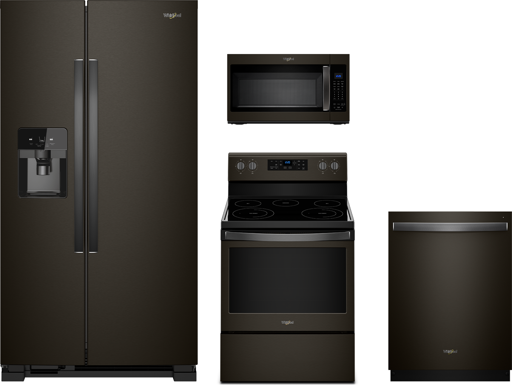 Whirlpool® 4 Piece Kitchen Package-Fingerprint Resistant Black Stainless Steel with a side-by-side refrigerator, free standing electric range, built in dishwasher and over the range microwaveRead More