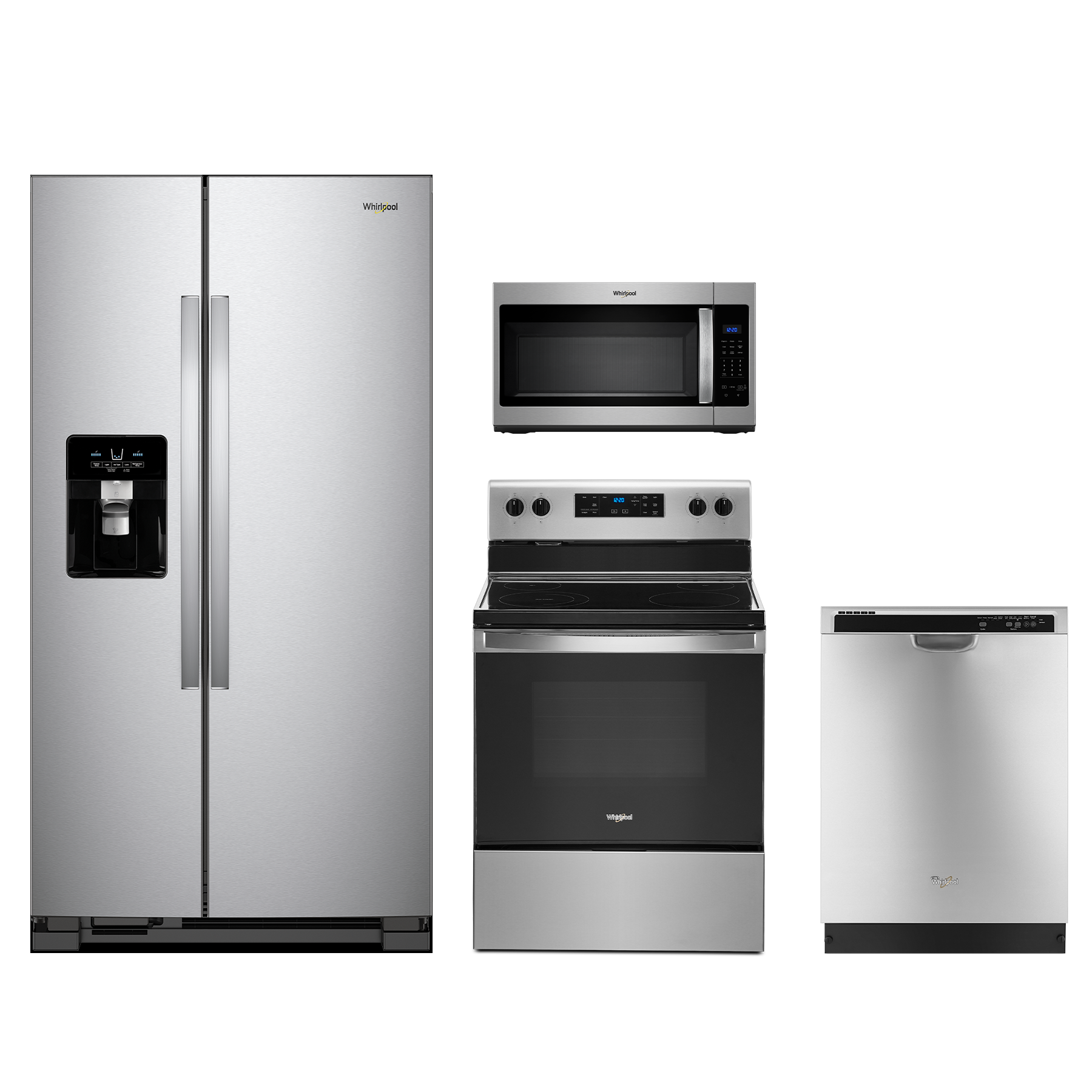 Whirlpool® 4 Piece Kitchen Package-Stainless Steel with a side-by-side refrigerator, free standing electric range, built in dishwasher and over the range microwaveRead More