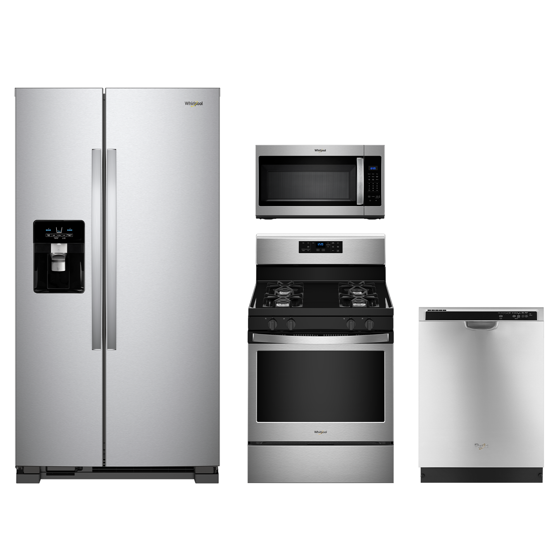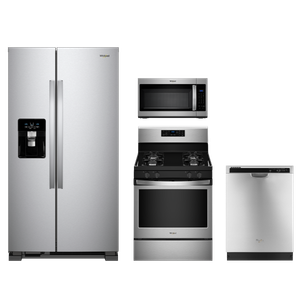 Whirlpool® 4 Piece Kitchen Package-Stainless Steel with a side by side refrigerator, free standing gas range, built in dishwasher and over the range microwaveRead More