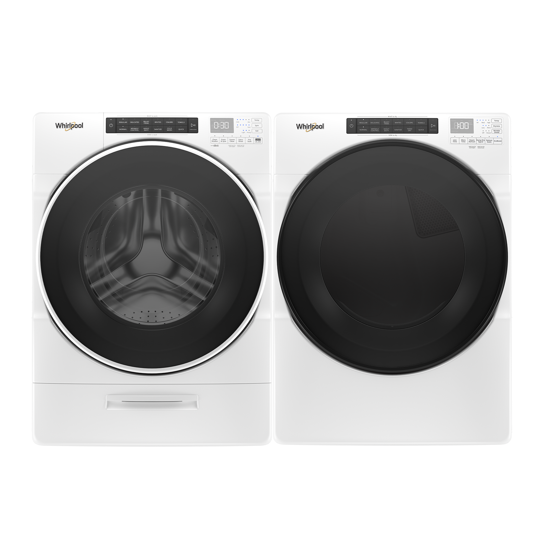 Whirlpool® White Front Load Laundry Pair with a 4.5 cu. ft. capacity front load washer and a 7.4 cu. ft. capacity front load electric dryer.Read More