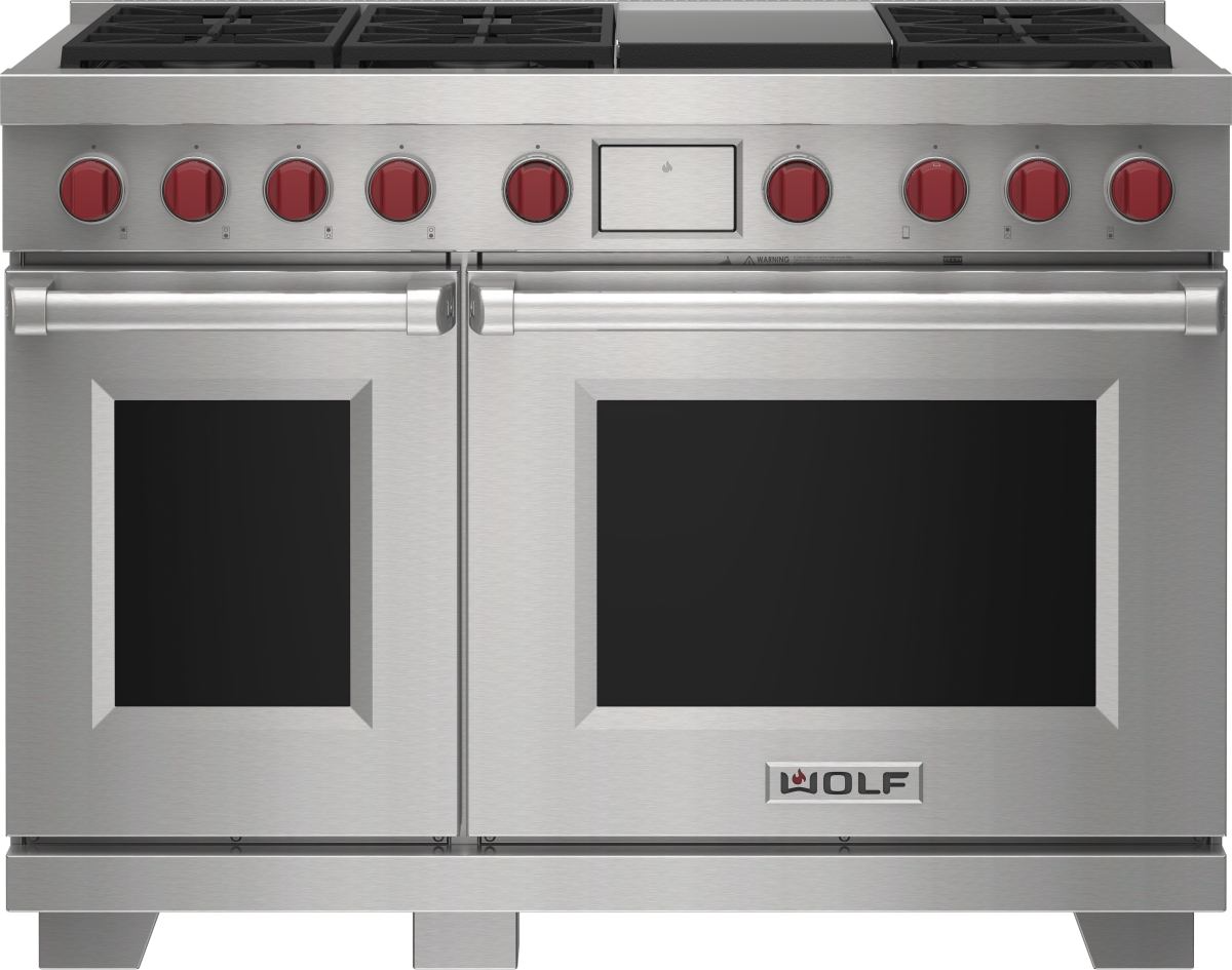 Wolf® 48" Stainless Steel Freestanding Dual Fuel Range and Infrared Griddle features dual-stacked, sealed burners, Dual VertiFlow™ convection system, Gourmet Mode, 10 chef-created cooking modes, LED backlit control bezels, self-clean, delayed start, timed cook, and Sabbath features.Read More